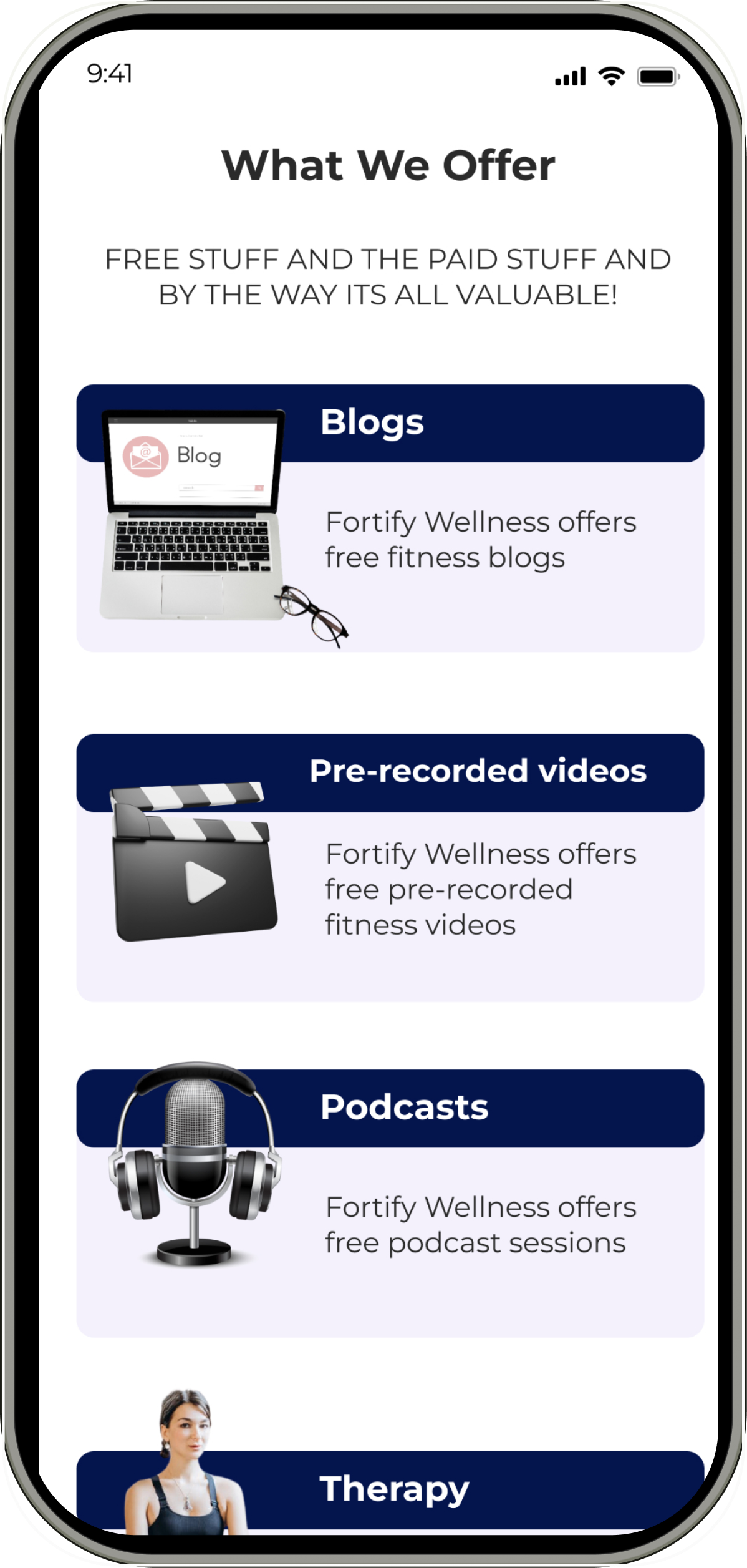 Integrated a dedicated section for Therapy Coaching and Podcasts, providing users with an array of mental health resources.